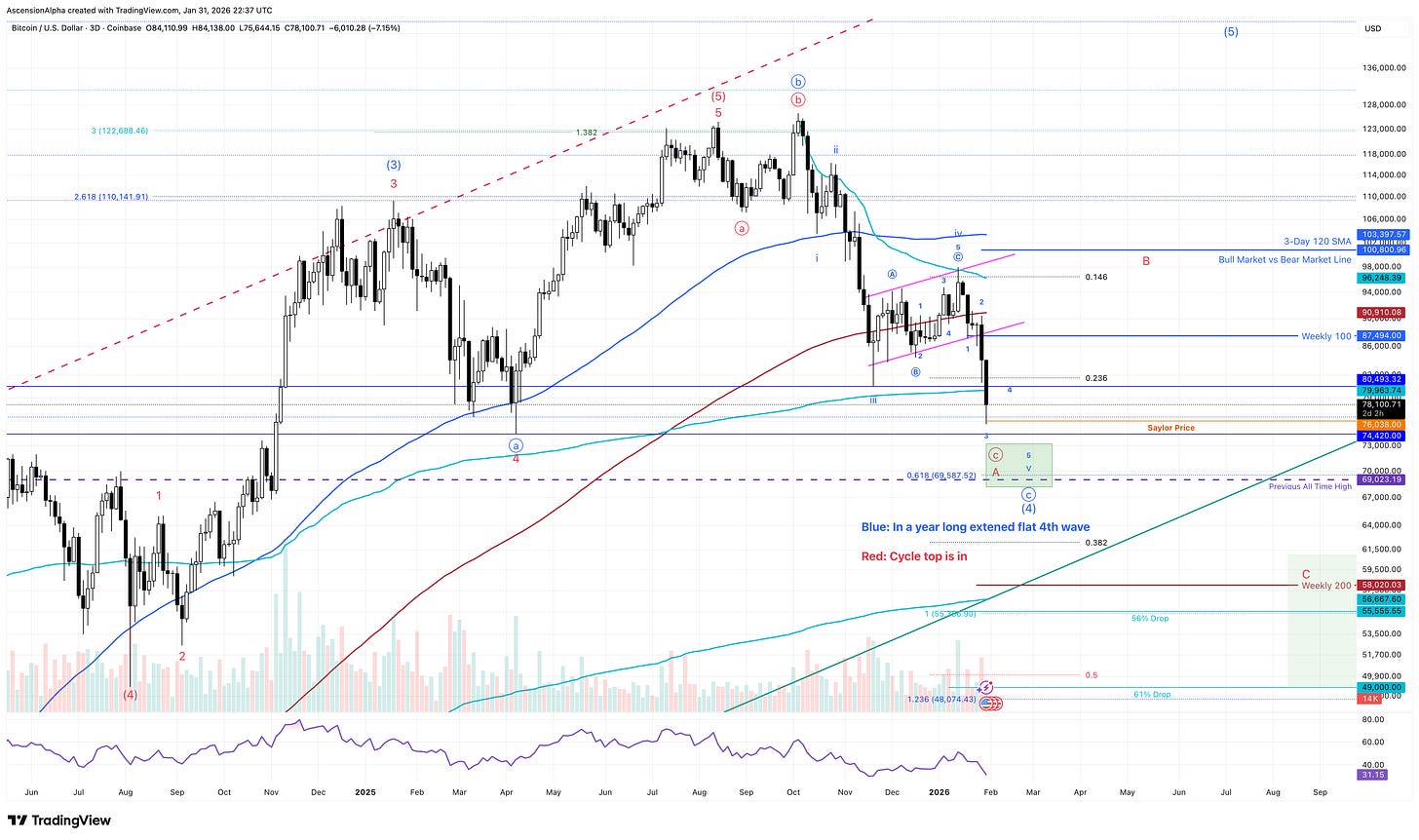 If I could script the perfect BTC setup, we’d wick down into $69,000 next week, hit 30 on weekly RSI for a high-confluence buy signal, then bounce over the next one to two months to retest the 120-SMA on the 3-day chart. That would be followed by a final C wave breakdown to a new low near the 200-week SMA on bullish RSI divergence. If that happens—which it won’t, because BTC never wants to make things that easy—I’ll have my trading year made.