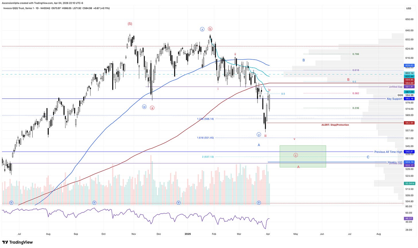 Since Tuesday’s strong reversal candle on elevated volume, I’ve been watching for a relief bounce into April. However, most of the major downside setups remain intact. The QQQ still needs a decisive close above its 200-day SMA to negate the risk of a quick flush toward the $540 zone.