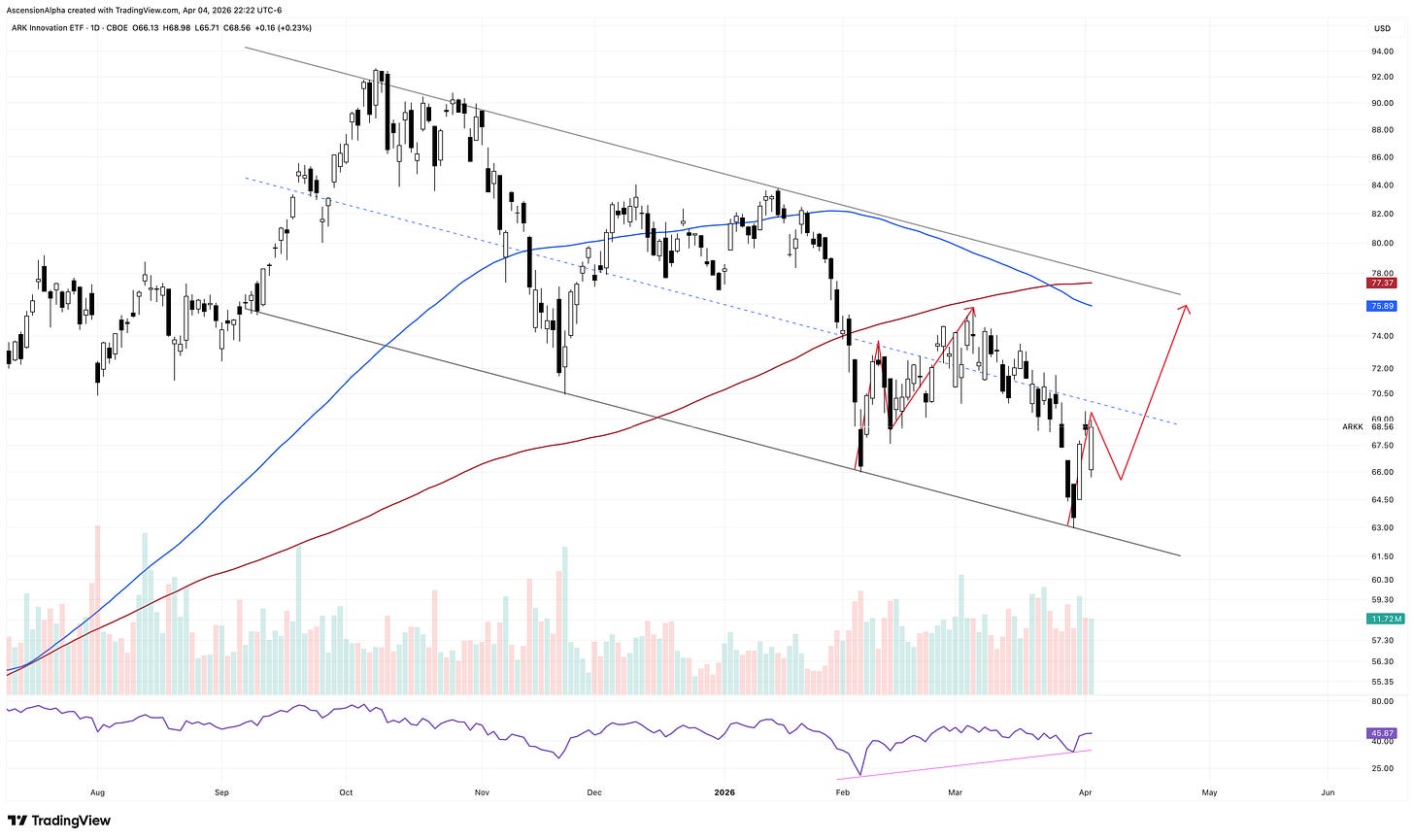ARKK remains in a well-defined downtrend channel and recently found support at the lower trend-line. A move higher, similar to February’s relief rally would make sense. It should find resistance near the $75-$80 level, where the upper channel line converges with longer-term moving averages.