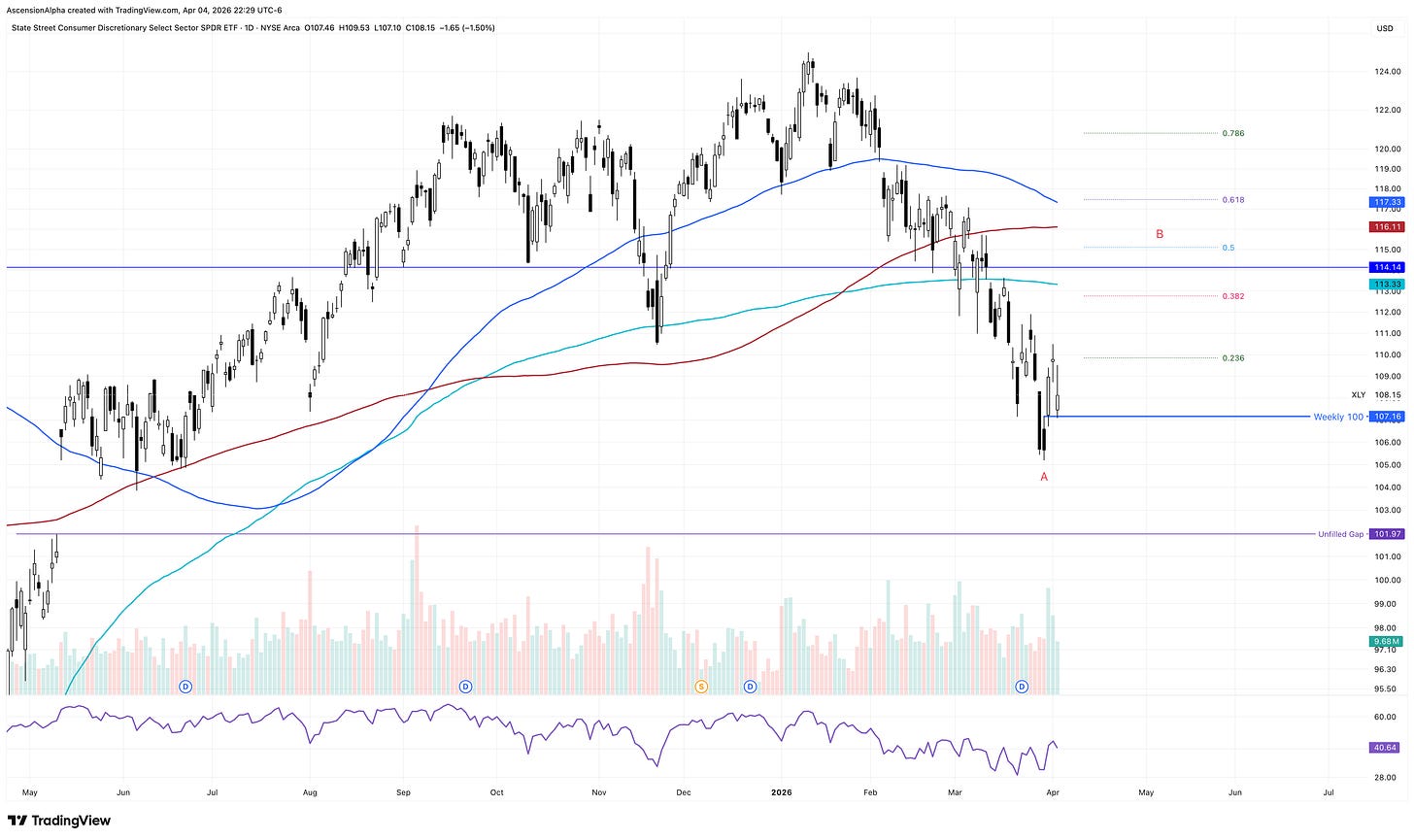 XLF (Financials), XLY (Consumer Discretionary), XLP (Consumer Staples), and XLV (Health Care) found footing near the 100-week SMA.