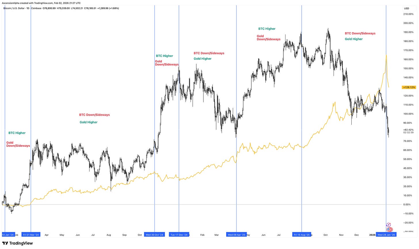 With so much discussion around capital rotating out of metals (GLD and SLV) and into Bitcoin, I took a closer look at the correlation. Since the launch of the Bitcoin ETFs, there appears to be a loose inverse relationship between the two. When BTC is moving sideways or lower, gold has generally been trending higher. When gold is consolidating or pulling back, BTC has tended to trend higher.
