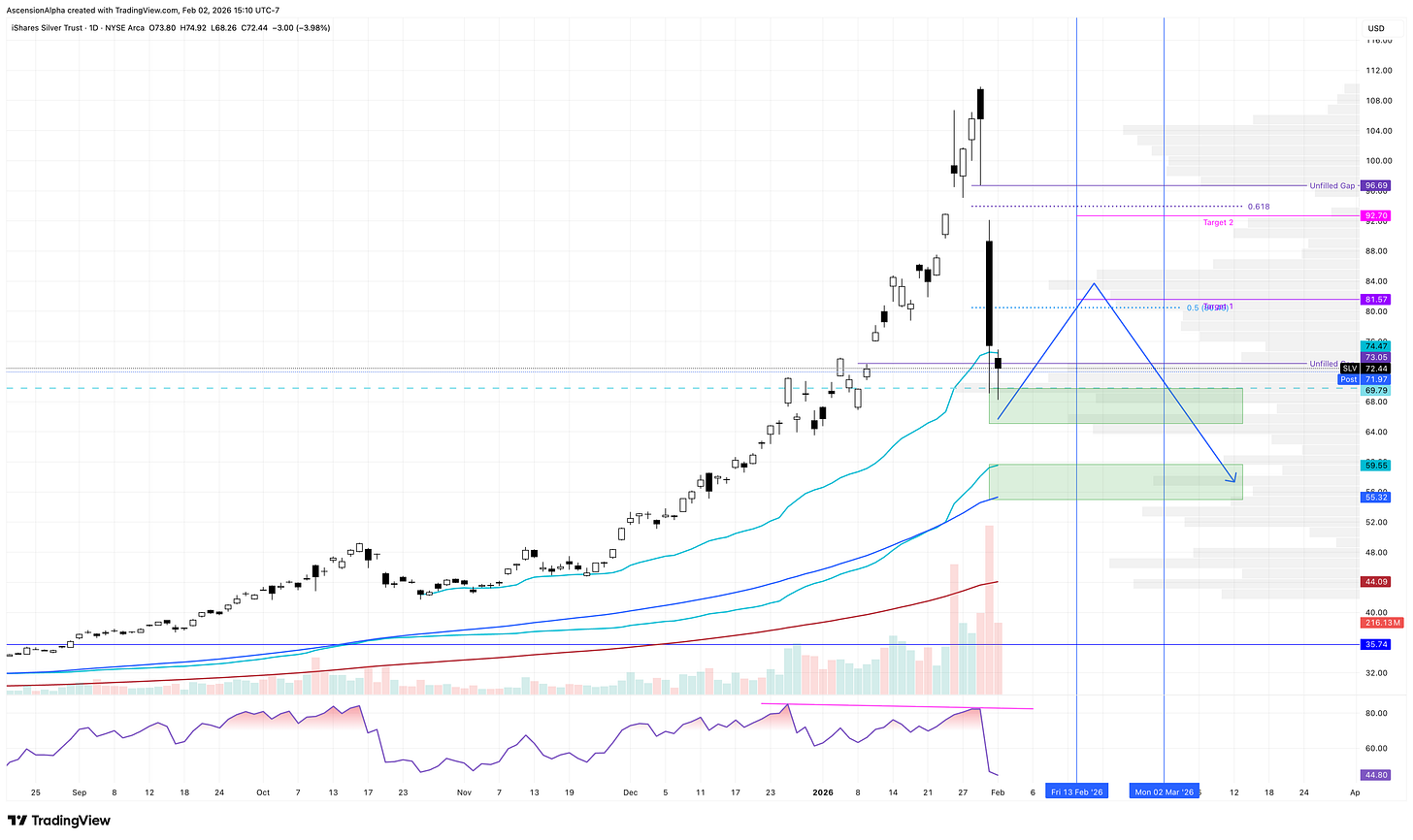 SLV is attempting to bounce after last Friday’s sharp selloff. I think there’s a reasonable chance we see a push higher toward the $83–$96 area before additional weakness sets in. If instead price continues lower, support should come in near the $65–$55 zone. I continue to expect SLV to track the 2011 analog fairly closely and see a high probability of a bullish move back to at least the 50% retracement of Friday’s candle near $80.00, with a possible extension into Friday’s gap around $93.00. I break down the similarities between the 2011 analog and today’s price action in the video below.