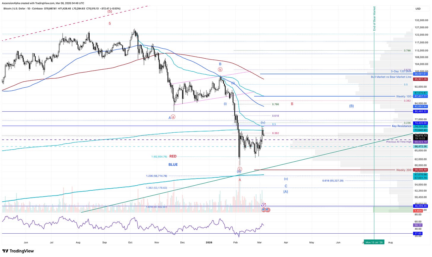 If BTC breaks above $75,000, it is likely in a B wave higher in my red count. That B wave could be a sizable bear market bounce pushing up into the $80,000 to $90,000 region. From the recent lows that would be roughly a 45 percent move if price rejects near the 100 week SMA around $87,000.