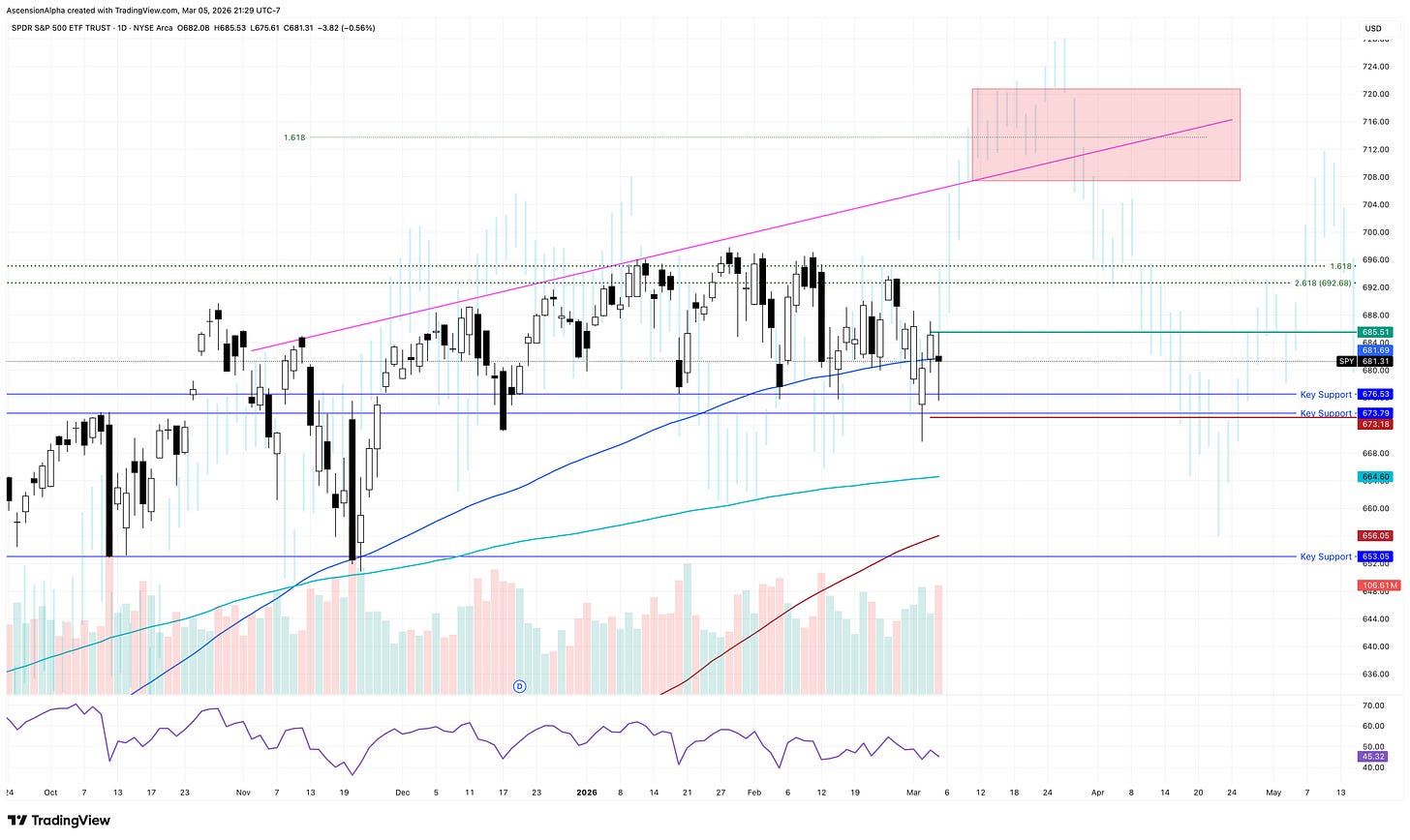 Thursday’s SPY candle pretty much summed up the last three months: a classic bearish indecision candle perched right on key support, sporting large upper and lower wicks. Indecision at critical levels has been the defining story of 2026 so far.
