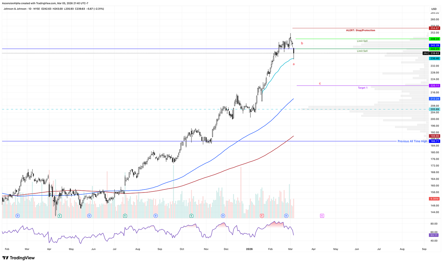 I also believe JNJ is very close to (or already in) a meaningful correction. It closed below $242 key support and traded down into the anchored VWAP from the earnings pivot. If it retests higher, forms a lower high, and then breaks that anchored VWAP, I think we could see a sizable retracement over time—back toward the earnings candle body.