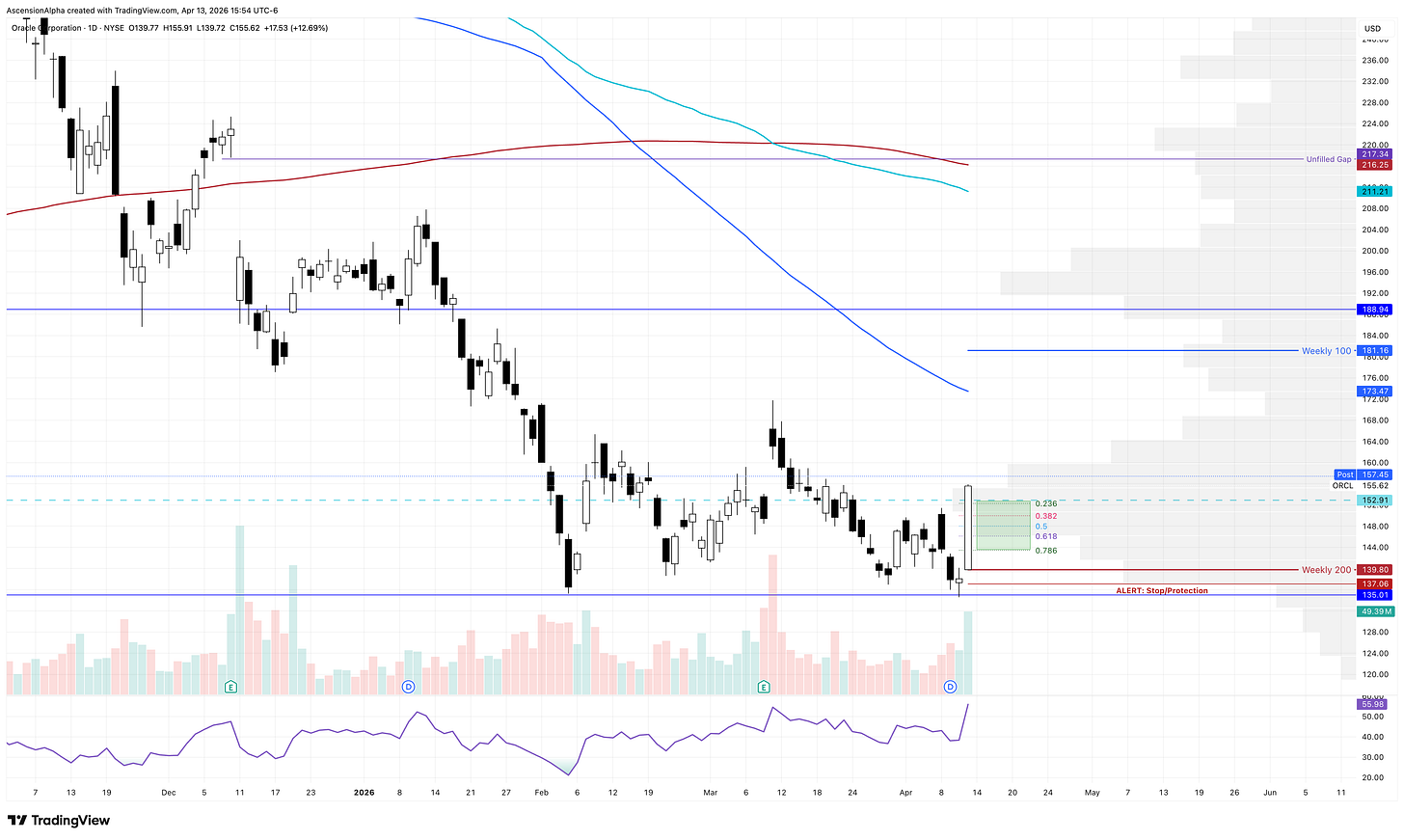 Oracle has been an absolute dumpster fire lately, but the chart is starting to repair. After basing for nearly 70 days, we’re finally seeing strong bullish strength come in right off the 200-week SMA. Monday delivered a 13% rip higher, bouncing exactly off that key level.