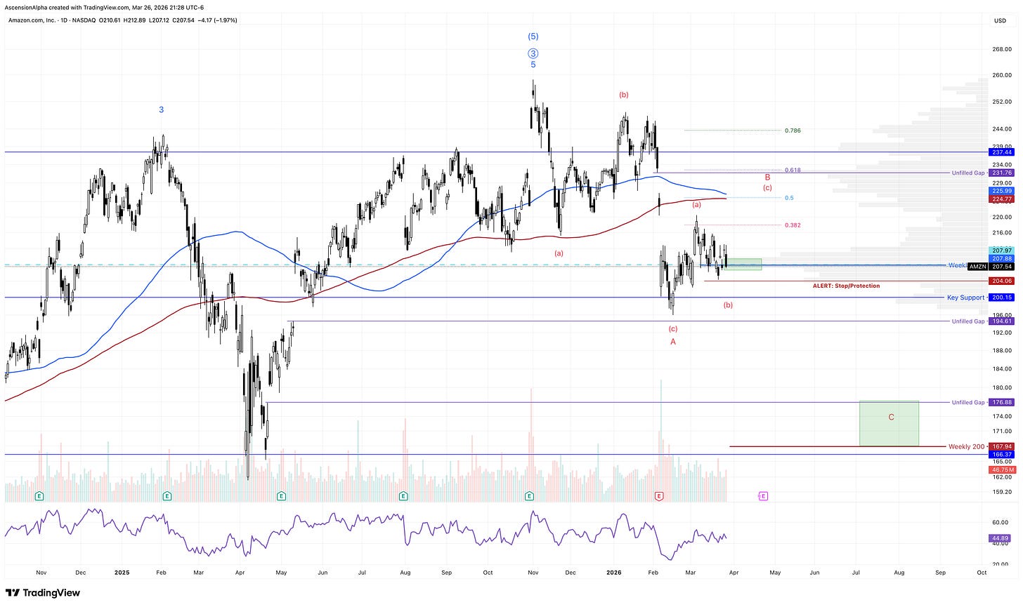 I expect AMZN will ultimately erase most (if not all) of its 2025 gains in a final C-wave, with longer-term support around the 200-week SMA. The question is timing: will it deliver one more decent bounce first, or head straight down? AMZN is one of the choppier names right now. In a headline-driven market, it is close to a coin flip. Watch the 100-week SMA closely. A break below it increases the odds of a direct move toward the 177 dollar level.