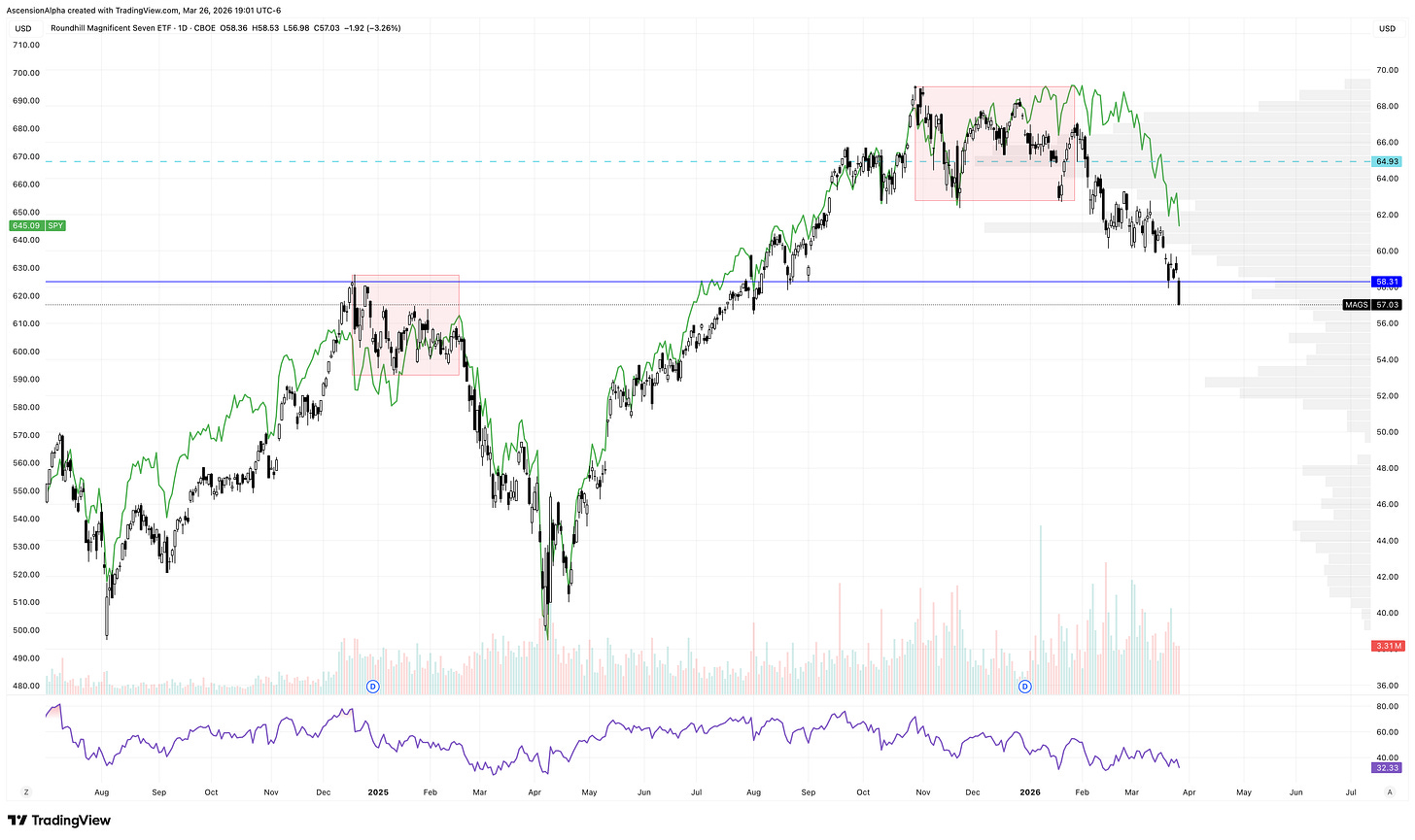We first saw signs of weakness in the MAGS (Roundhill Magnificent Seven ETF) when it topped on October 29th alongside the QQQ. While the SPY managed a new high in January 2026, both QQQ and MAGS formed lower highs. This divergence echoed a similar pattern in 2025, when MAGS peaked 63 days before the broader market. These stocks are truly make-or-break for the indices right now, and the setups are leaning heavily toward break.