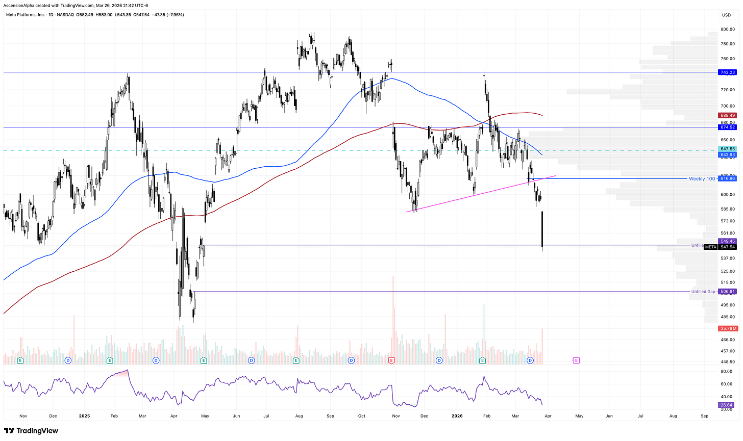 Last and probably least we have META which dropped 8% on Thursday after losing its 100-week SMA just days earlier. It also broke the key trendline held since the November low. See, losing the 100-day SMA is generally an early warning sign of more trouble ahead.