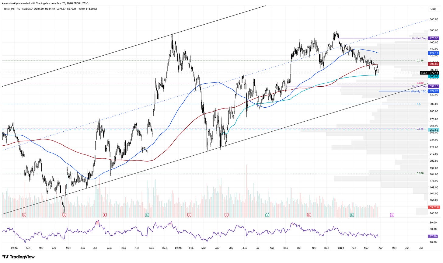 In the near term, TSLA continues to respect a massive parallel channel dating back to 2023. The lower trendline of that channel aligns nicely with the 100-week SMA, suggesting that zone is likely an area to watch if it drops further.