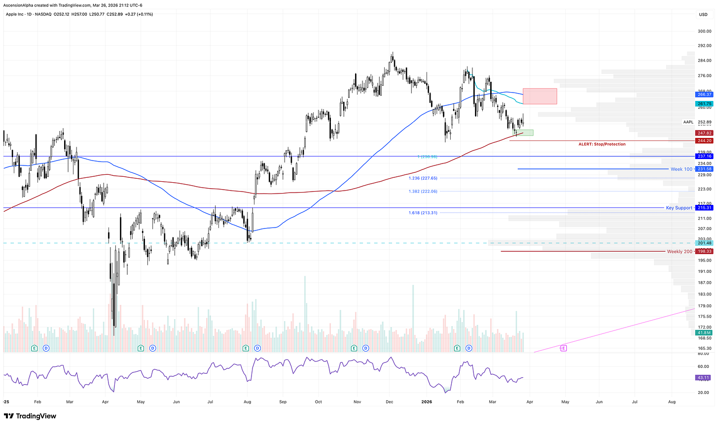 If AAPL loses the 200-day SMA, the next major support lines up with the 100-week SMA and horizontal level near $237, representing roughly a 20 percent drawdown from all time highs. A break below that would likely target the $215 area (major gap and support).