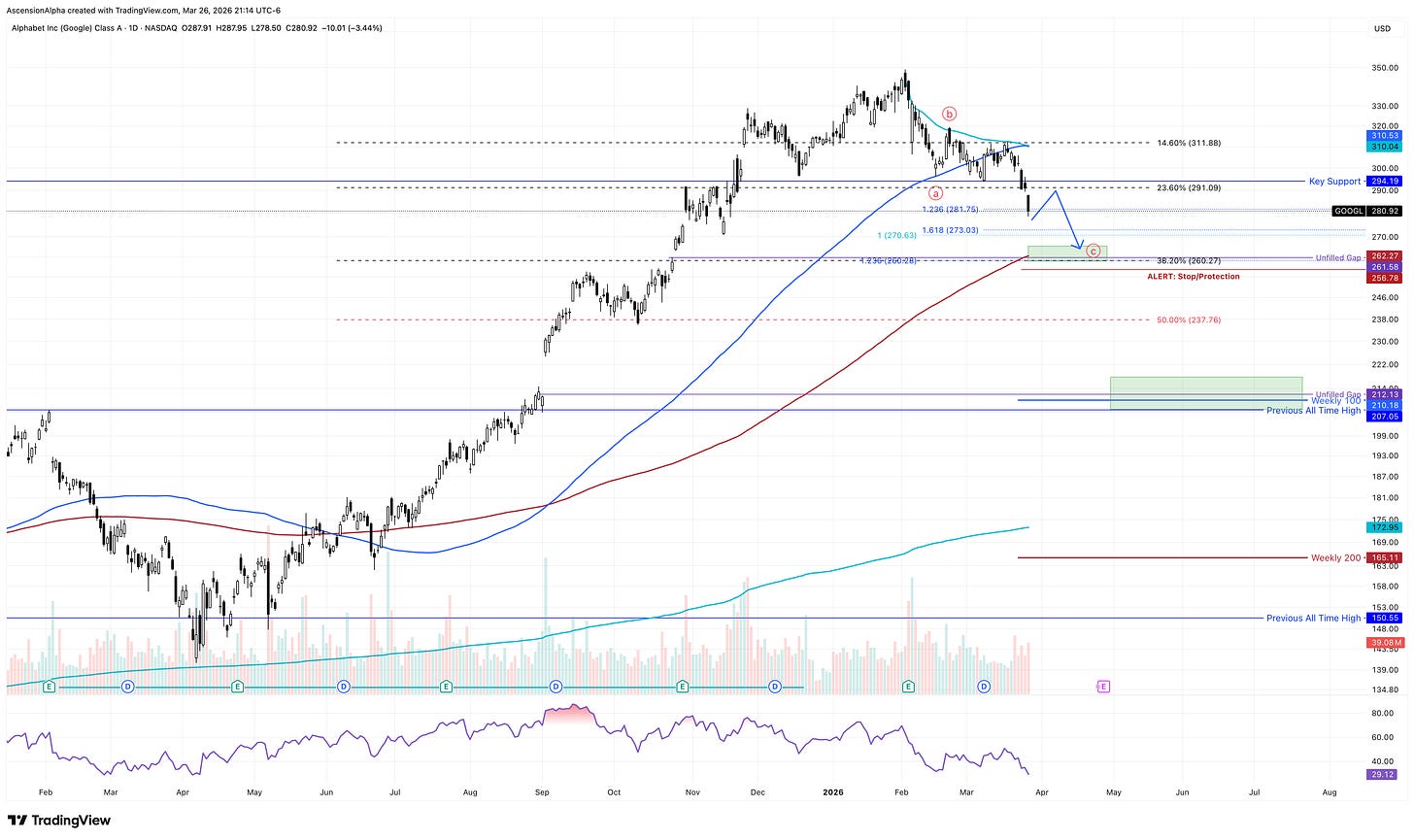 GOOGL seemed like the safe haven among the big tech names until its February earnings gap exposed cracks. Since the post-earnings gap down, the chart has shown repeated breakdowns: a swift close below the February 5th bullish candle, loss of the 100-day SMA, and repeated rejections at the anchored VWAP from the highs.