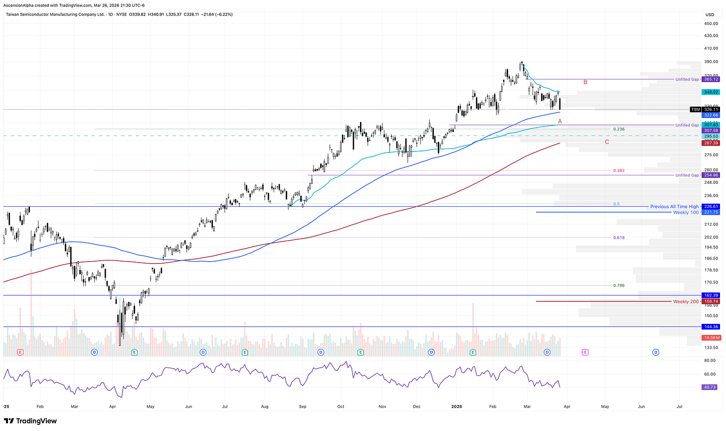 Though not in the QQQ or SPY, TSM is one of the world’s largest companies and a critical part of the AI ecosystem. It serves as a clean gauge of sentiment toward AI right now. TSM is holding up well, down only 16 percent from its all-time highs, and has yet to test its 100-day SMA.