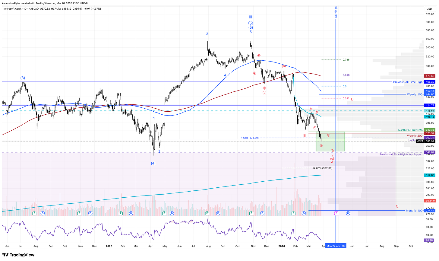 A multi-week to multi-month bounce looks probable soon, potentially taking MSFT back to at least $412 and more likely toward $450 (underside of the 100-week SMA). That said, anyone going long here should recognize the elevated risk: this is uncharted territory for the stock in over a decade. In a worst-case scenario, the 200-week SMA could flip to resistance, and a gap-down on earnings could push MSFT back into the 200s.
