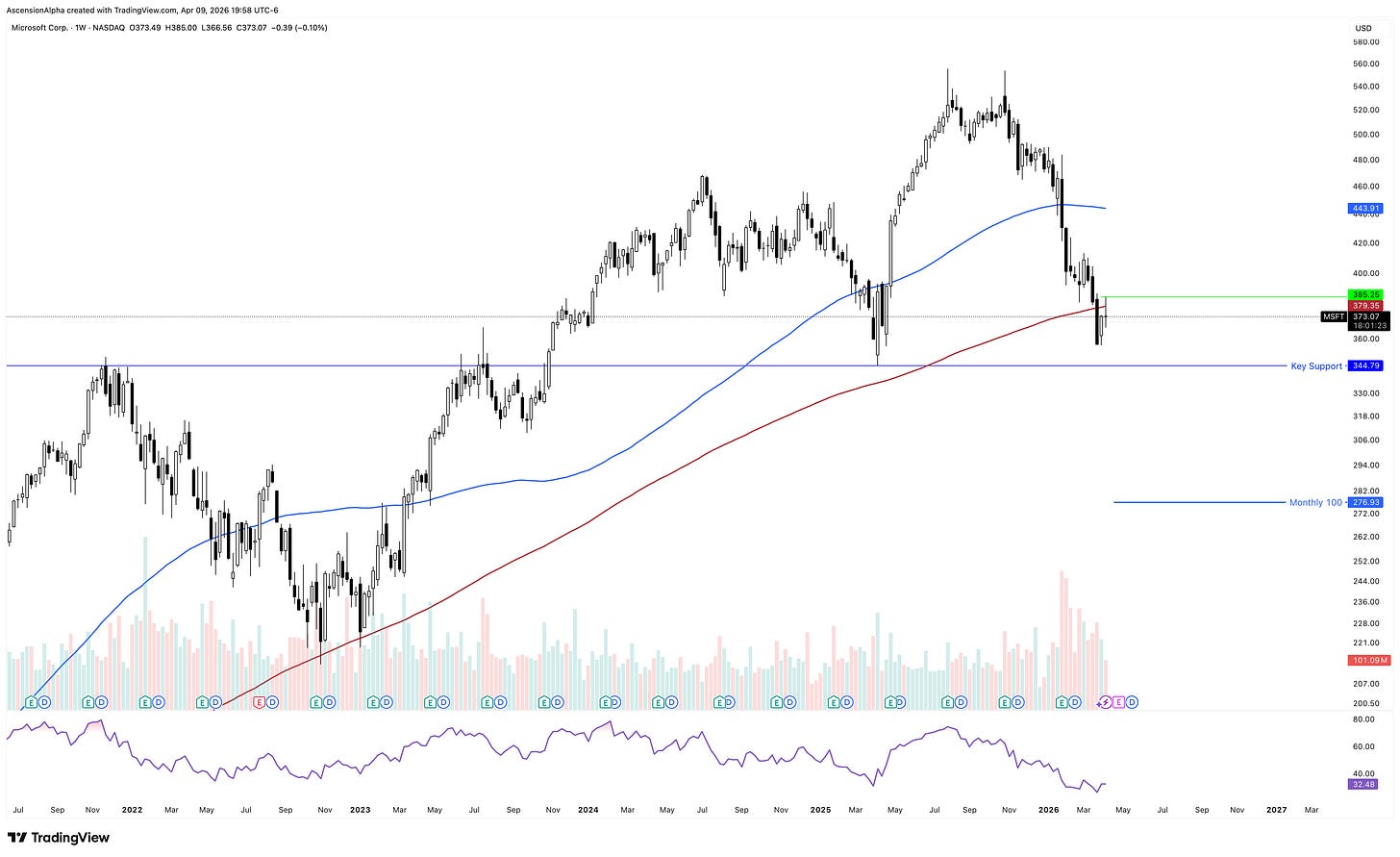 The gap up on MSFT on Wednesday was aggressively sold into, sending it back below the 200-day SMA and creating a pretty bearish retest and rejection of the 200-week SMA scenario. For anything meaningful to happen on the upside, MSFT needs to reclaim that 200-week SMA and Wednesday’s candle. With earnings coming up in about 19 days, that could act as a catalyst, but for now, there’s nothing on the chart suggesting immediate upside.