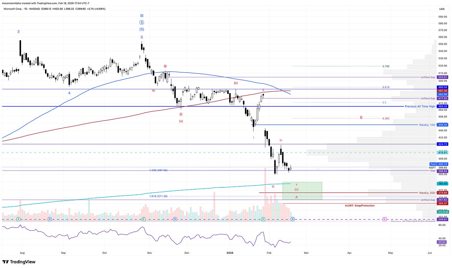The key question I’m wrestling with on MSFT: does it print one final new low into the $383 to $375 zone? That would complete the wave structure cleanly and align perfectly with the 200-week SMA, a monster support level that’s held since the 2013 lows.