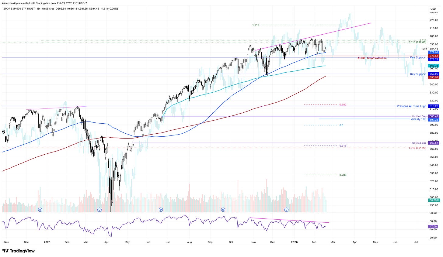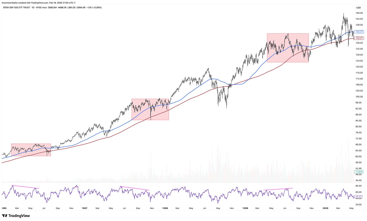 The reason I do not find those quite as relevant is that each of those so-called consolidations saw at least a 13% peak-to-trough decline. A 13% pullback in SPY from here would align with the type of reset I expect to see if key supports break. If anything, these actually support the thesis outlined above: these patterns historically tend to resolve with a 10%+ correction.