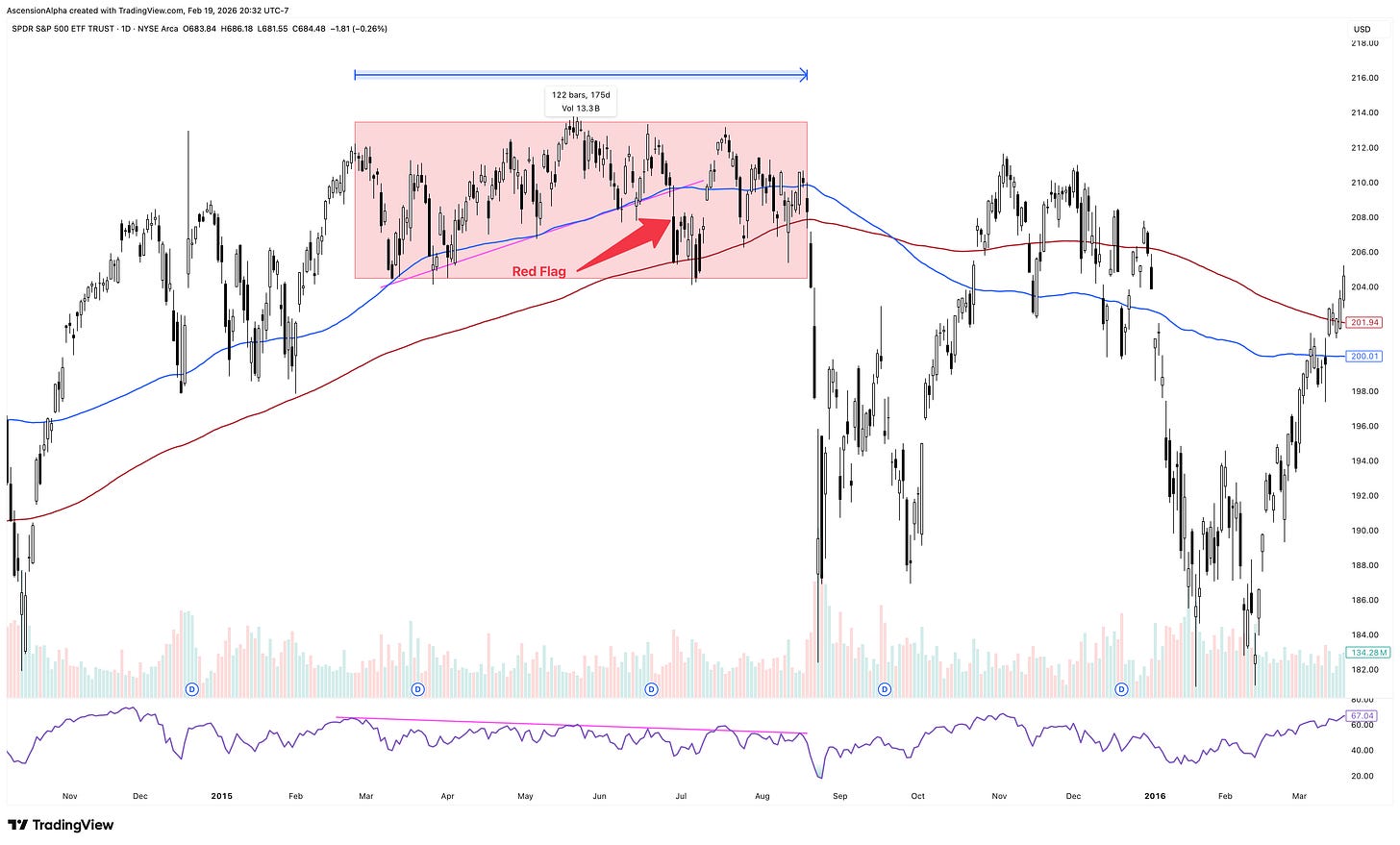 Before that, we have to rewind to 2015. After an extremely powerful bull run, the market stalled and chopped sideways for an astounding 175 days in a tight 3% to 4% range. Then came a sharp, nearly 14% plunge in just over a month.