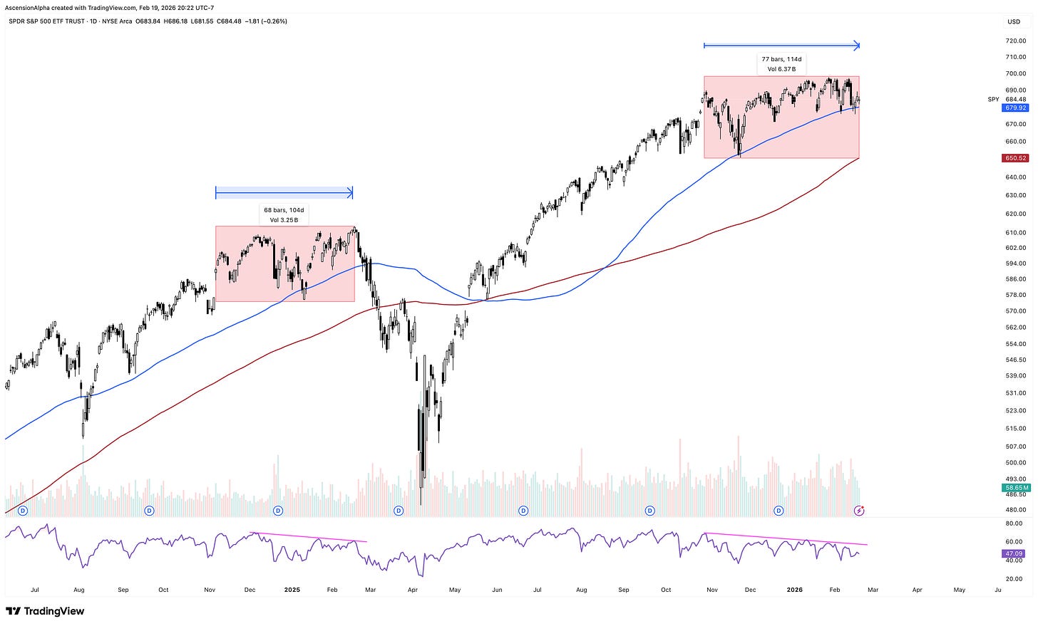 SPY continues to grind sideways, closing Thursday at essentially the same level it was 118 days ago in mid-October 2025, right around when many markets topped out and began this extended consolidation. During that stretch, SPY has dropped no more than 5.5% peak to trough, with most of the action confined to a tight 3–4% range. It has managed to hold the 100-day SMA so far, even as bearish RSI divergence continues to build.
