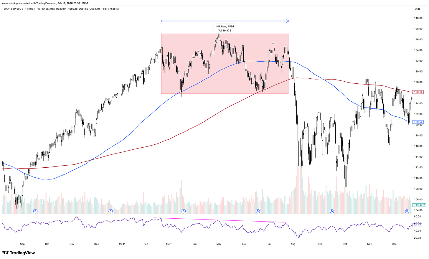 Further back, 2011 offers another strong comparison. After a powerful run, the market consolidated for roughly 158 days within an 8% range. That period was followed by a nearly 19% decline. Price recovered somewhat but ultimately carved out a lower low double bottom, roughly 22% below the prior high, before finally stabilizing.