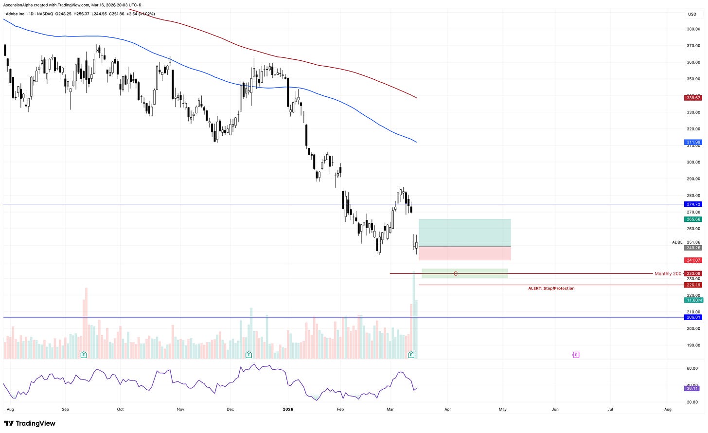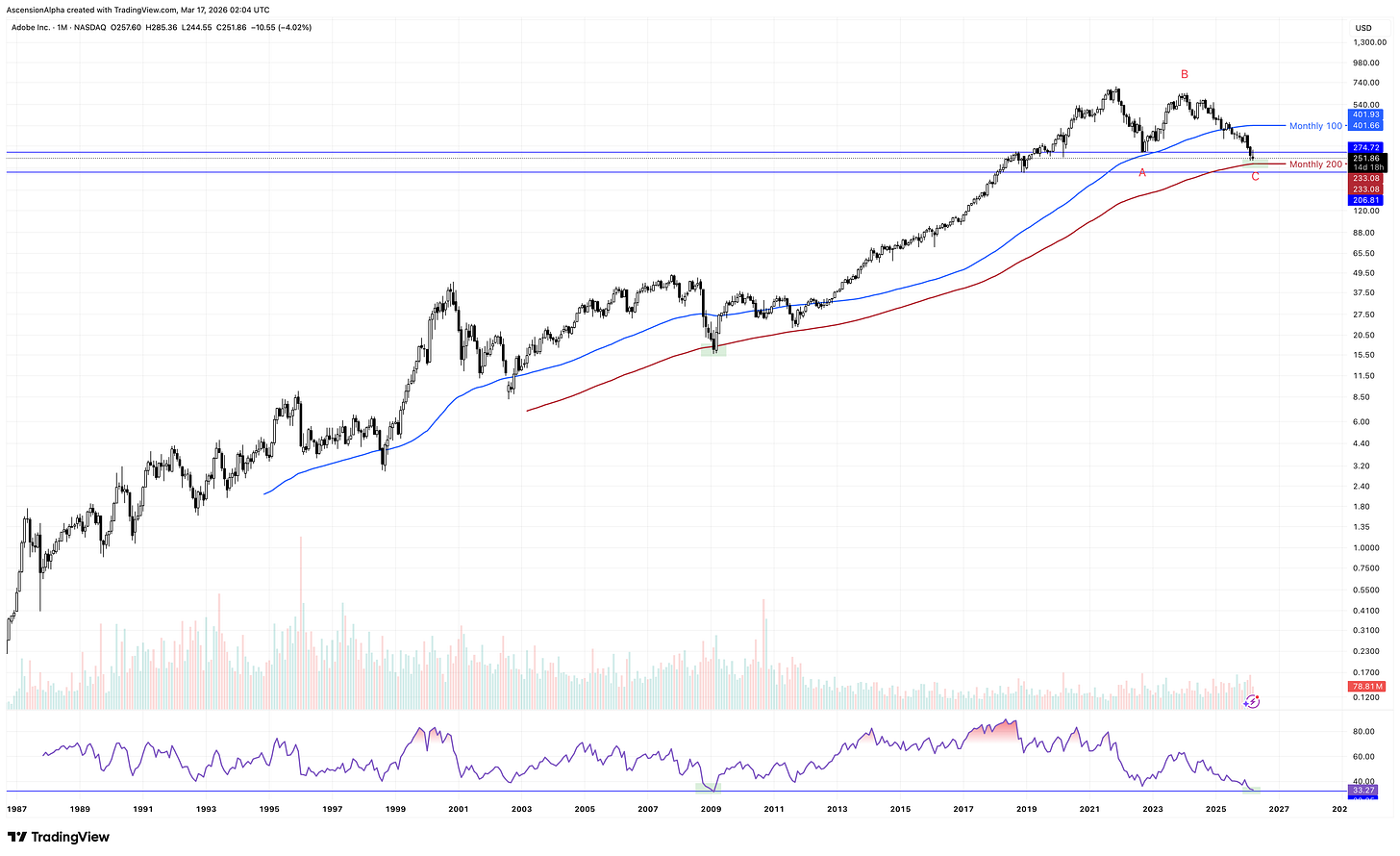 Honestly, I will go with a bit of a combo approach. Take a smaller risk trade here with a tight stop, while keeping the ability to add into the position if price reaches the 200-month SMA. If I can pick up ADBE near that level, I think the probability of at least a 10% bounce is very high, and potentially a good deal more.