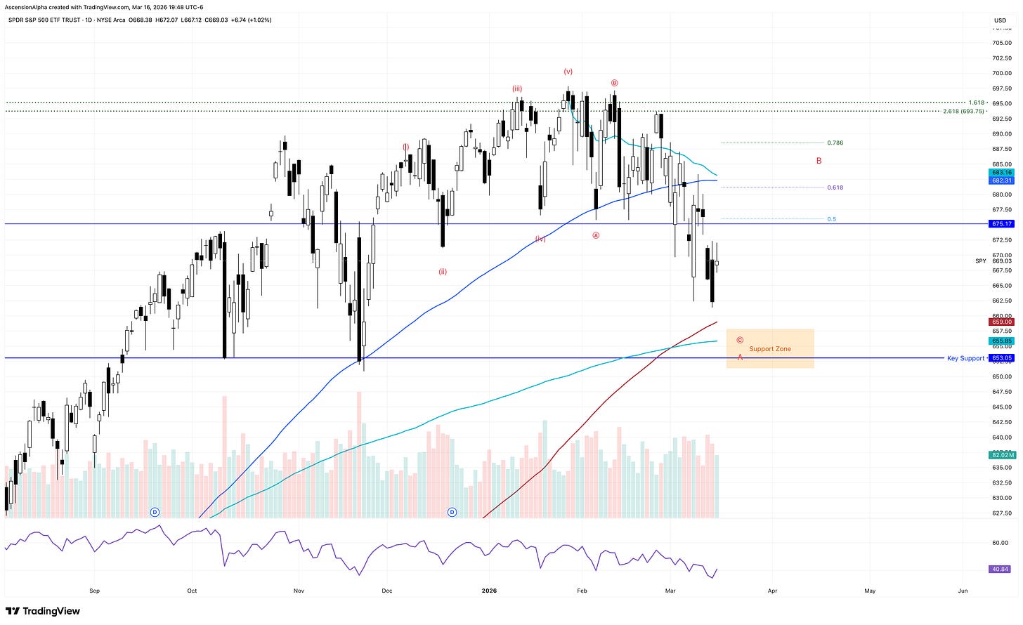 Friday’s candle did print a new low, completing a pattern off the highs. A strong bullish gap with follow-through would now signal the next leg higher is underway. Until we see a decisive close above $674, I’m still watching for a final flush into the $650s, where the 200-day SMA resides.