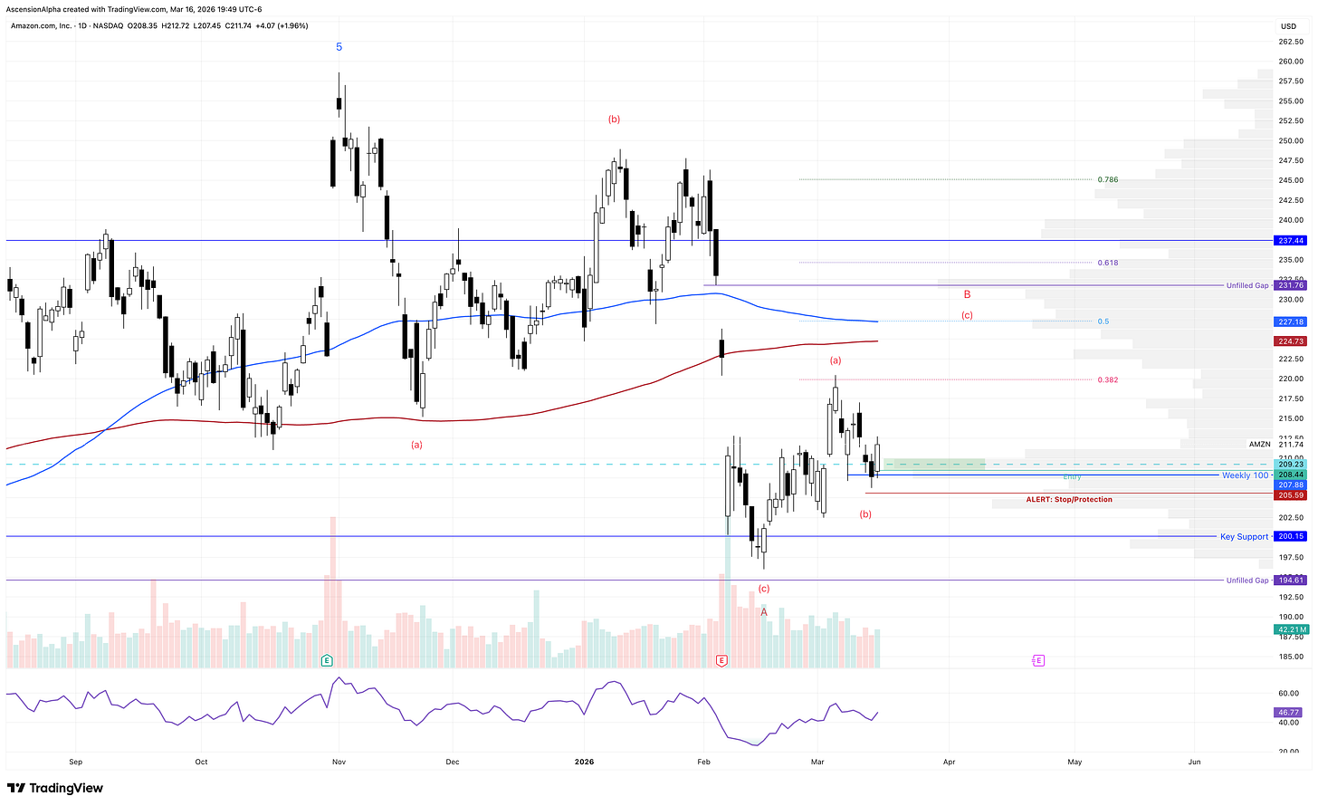 Among the TDT names, AMZN currently offers the most attractive quick-trade risk/reward. It’s holding the 100-week SMA (a level I love), which prompted me to buy it Monday morning. I’ve noted before that it could see a B-wave move up to fill those overhead gaps, a setup that aligns nicely with the potential B-wave bounce I’m tracking in SPY. If it starts closing below the 100-week SMA, I’ll protect the position and or exit.