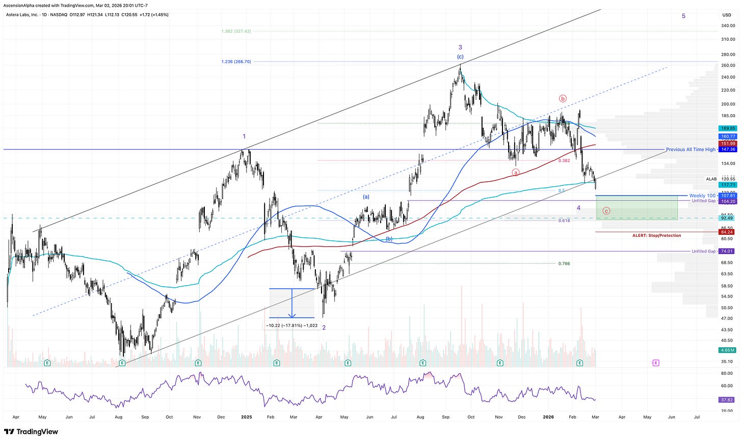 However, if the AI trade continues to unwind, ALAB could push even lower. The prior two drawdowns were roughly 68 percent, and the stock is only down about 57 percent this time. For that reason, I would prefer to see a flush into the $105 to $90 range for optimal risk reward on a longer term swing. If it can reach that zone before any meaningful bounce, I would look for a move back into the $130s or even $150s. That rally could then be used to collar positions and lock in gains, with the ultimate objective being a move to new all time highs.