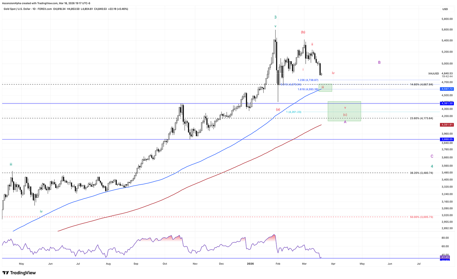 My base case is support coming in somewhere between $4,400 and $4,200, which would offer a solid risk-reward setup for a potential move back toward all-time highs, or the larger B wave in the more bearish scenario.