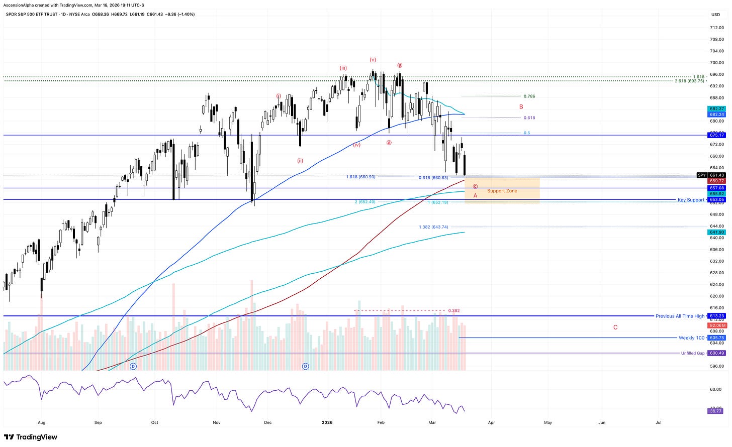 I’m open to a wick or quick flush below $653, but I do not want to see sustained selling below that level with expanding volume, gaps, or momentum. That would be a clear signal that the B wave bounce I’ve been yapping about for weeks is not going to materialize, and instead we’re on a more direct path lower.